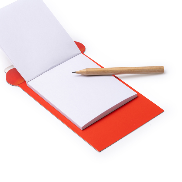 Iman de Natal com desenho do Pai Natal. Inclui bloco de notas com 45 folhas lisas e lápis de madeira