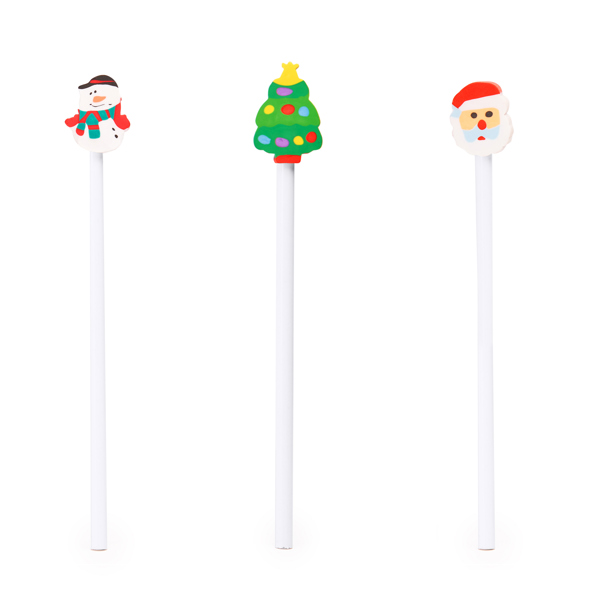 Lápis de madeira branco com borracha disponível em três desenhos de Natal: árvore, Pai Natal e boneco de neve.