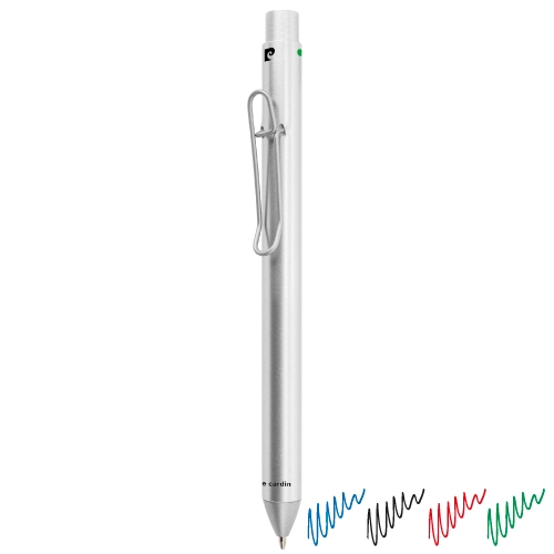 Esferográfica em alumínio com mecanismo visual de seleção da cor da tinta. Basta olhar para o ponto da cor pretendida e premir: preto, azul ou verde.