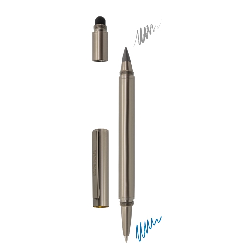 Caneta rollerball, lápis eterno e soft touch, tudo numa só peça.