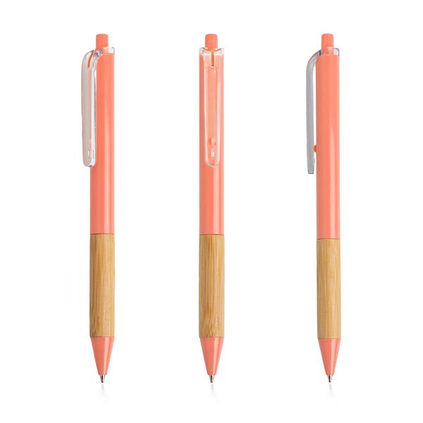 Esferográfica em ABS reciclado, com clip translúcido e acabamento em bambu na zona de pega, que combina design moderno com responsabilidade ambiental. Equipada com mecanismo de pulsar para maior praticidade, utiliza tinta preta. Perfeita para anotações, estudos ou uso profissional. Disponível em várias cores vibrantes, alia estilo, durabilidade e leveza, tornando-se uma opção prática e elegante para o dia a dia.