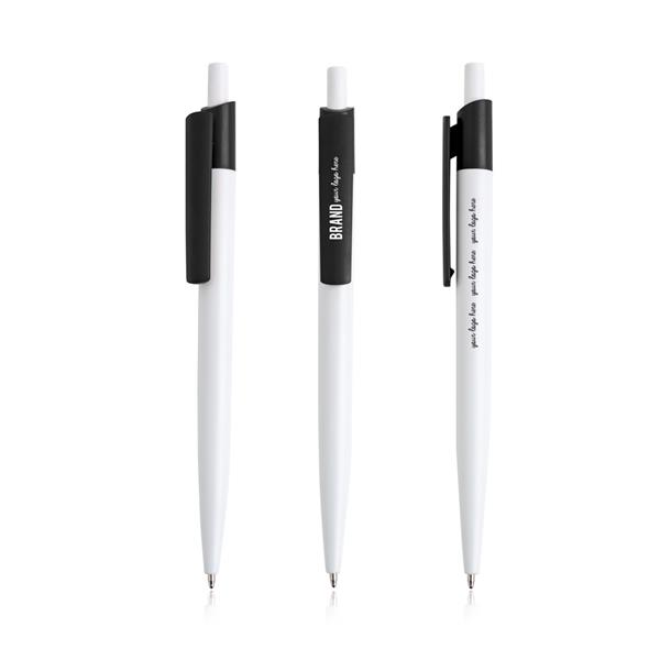 Esferográfica em ABS reciclado. Uma esferográfica reciclada, de design moderno, com clip largo colorido e corpo branco. Esta esferográfica de sistema push tem escrita azul