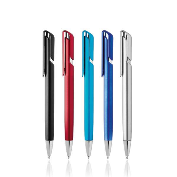 Esferográfica de plástico e cor metalizada. Escrita azul e sistema pulsar. Corpo colorido com detalhes prateados. Clip largo, ideal para gravação.