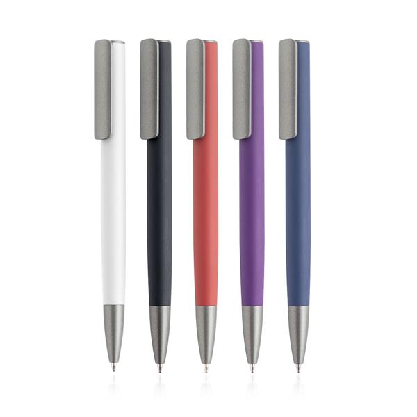 Esferográfica em alumínio reciclado acabamento em borracha. Feita em alumínio reciclado de desperdício e em fim de vida útil, utilizando processos de derretimento e aproveitamento. Ao comprar esta esferográfica, está a ajudar a reduzir as libertações de carbono e a reduzir o lixo que deriva da não reutilização. Esta esforográfica de escrita azul apresenta um toque de borracha, um clip arredondado que lhe dão um ar de modernidade.