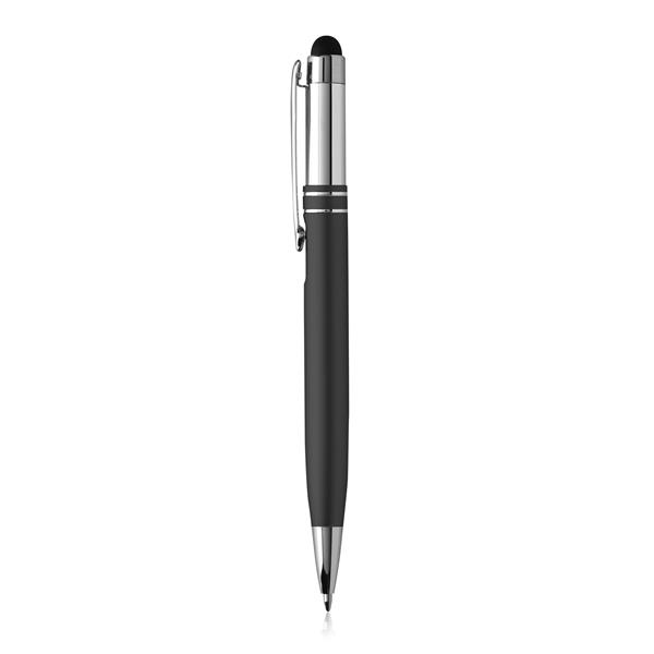 Esferográfica de alumínio e touch. Escrita preta e sistema push. Esferográfica clássica com detalhes em prateado. Dois anéis junto ao clip. Touch incluído. Ideal para gravar a sua marca num brinde que se equilibra entre a esferográfica comum e a elegância do metal e dos pormenores brilhantes. Escrita a preto. 14 cm