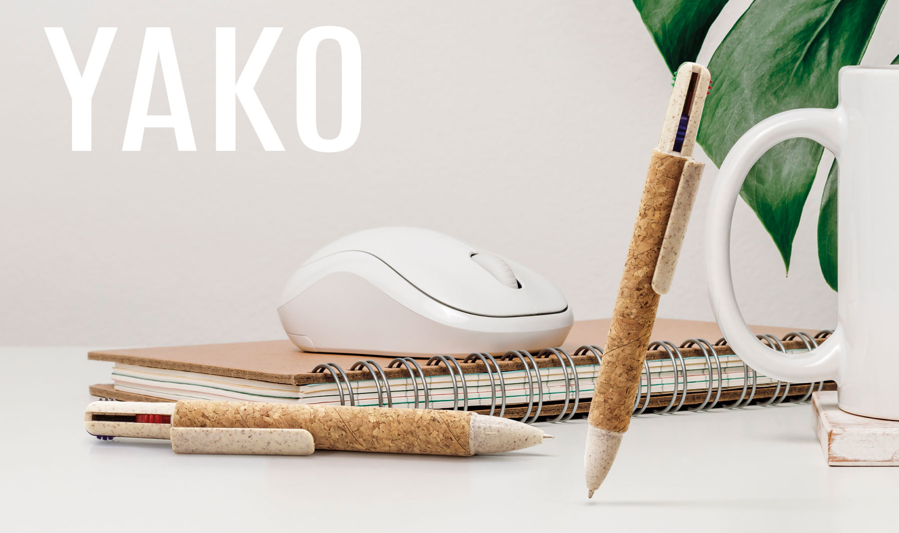 Corpo realizado em cortiça e detalhes em fibra de trigo com uma grande superficie de impressão.