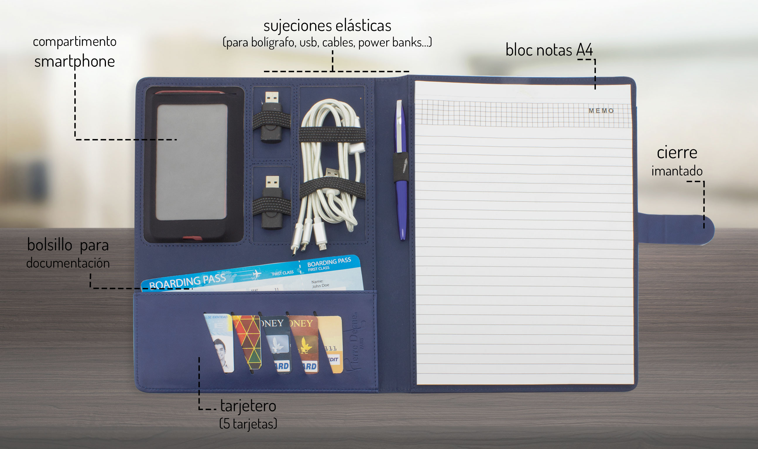 Se define pela sua qualidade, estética, desenho inovador e facilidade na zona de “PU leather” onde poderá gravar o seu logotipo em seco e a releve.