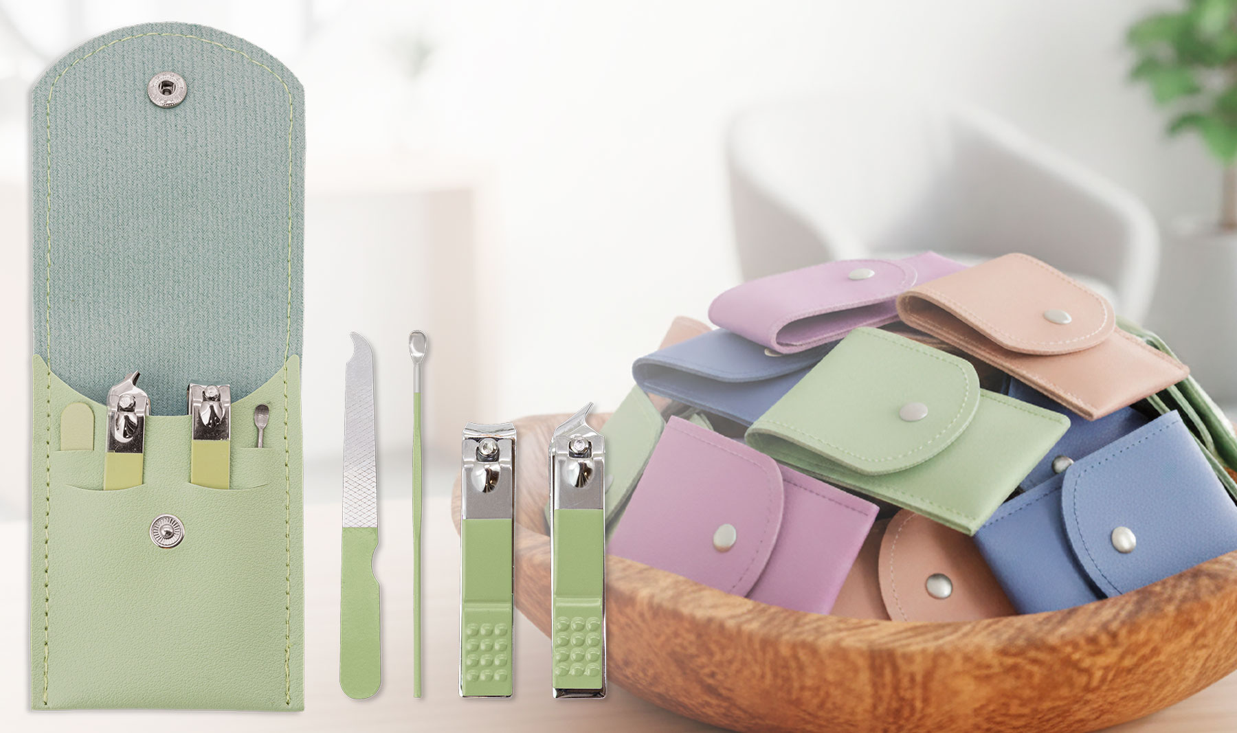 Kit de manicure, disponível em quatro cores, inclui dois corta-unhas, uma lima de unhas e uma ferramenta para cutículas.