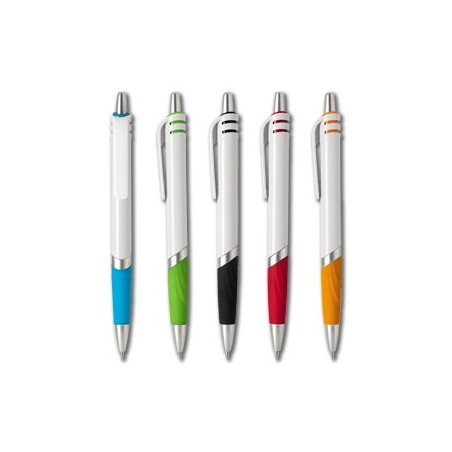 Caneta de plástico ABS com pega colorida e detalhes prateados, utiliza tinta azul e tem uma variedade de cores.