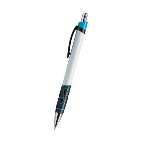 Caneta em plástico ABS com design clássico. Detalhes do clip e da pega em preto combinados com cores sortidas, tinta azul e botão de pressão prateado. É um dos nossos melhores produtos e está em conformidade com a norma Compliant Reach, que evita a utilização de materiais perigosos,