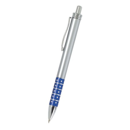 Caneta esferográfica de plástico ABS com clipe de metal. Área de pegada decorada com brilhos, combinada com corpo prateado. Inclui carga jumbo para maior durabilidade da tinta.