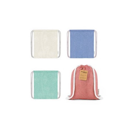 Mochila de cordas em material algodão reciclado de 120 g/m2. Cordas de fecho automático em algodão, com logotipo eco na etiqueta lateral e disponível numa variada gama de cores nature. Resistência até 4kg de peso.