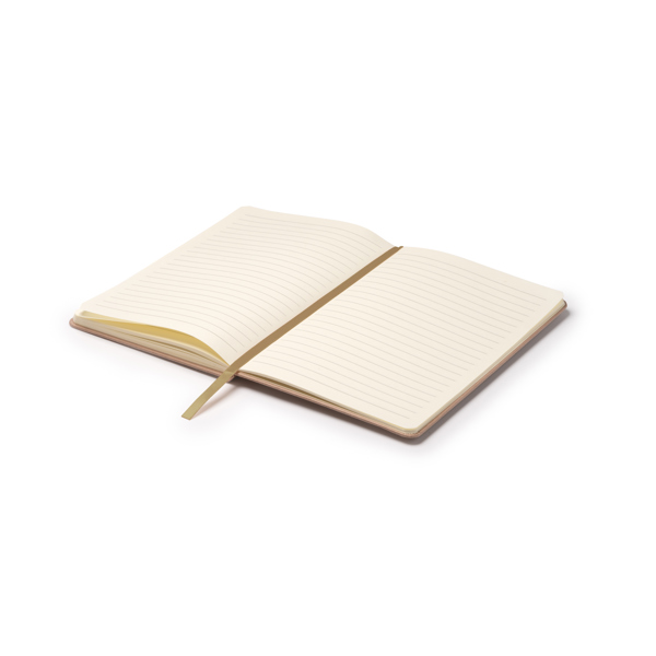 Bloco de notas de tamanho A5 com capa dura feita de restos de fruta. Inclui marcador de livros e elástico a condizer. Interior com 80 folhas pautadas, ideal para tomar notas com um toque ecológico e original.
