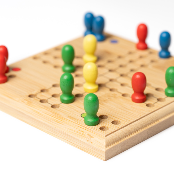 Conjunto de jogos de tabuleiro em bambu. Inclui um tabuleiro, um dado e 16 peças em 4 cores. Inclui capa de algodão. Apresentação em caixa de design ecológico.