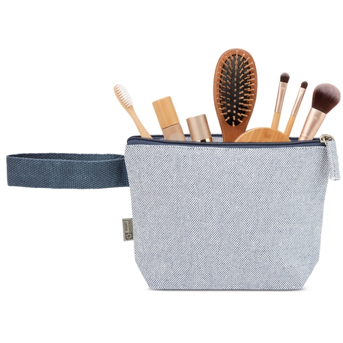Nécessaire confecionado em algodão reciclado com aspeto mesclado.