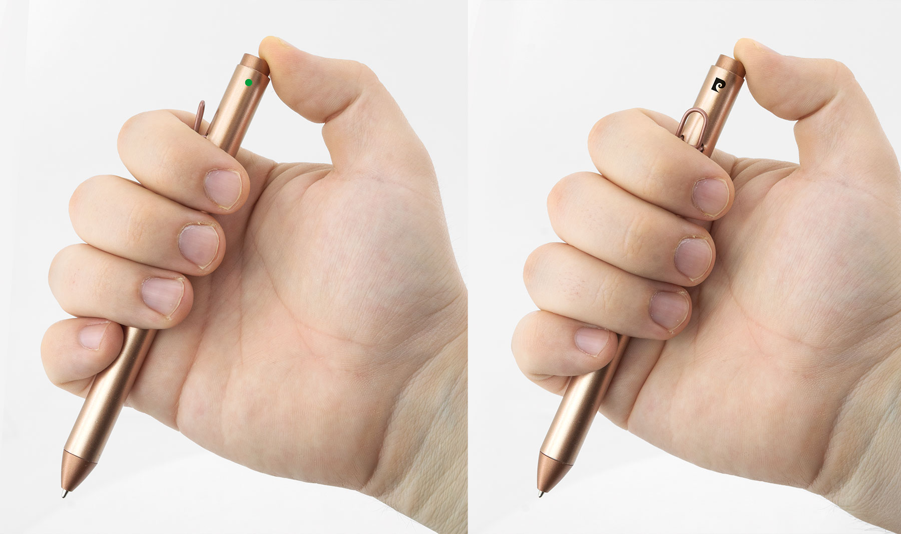 Esferográfica em alumínio com mecanismo visual de seleção da cor da tinta. Basta olhar para o ponto da cor pretendida e premir: preto, azul ou verde.