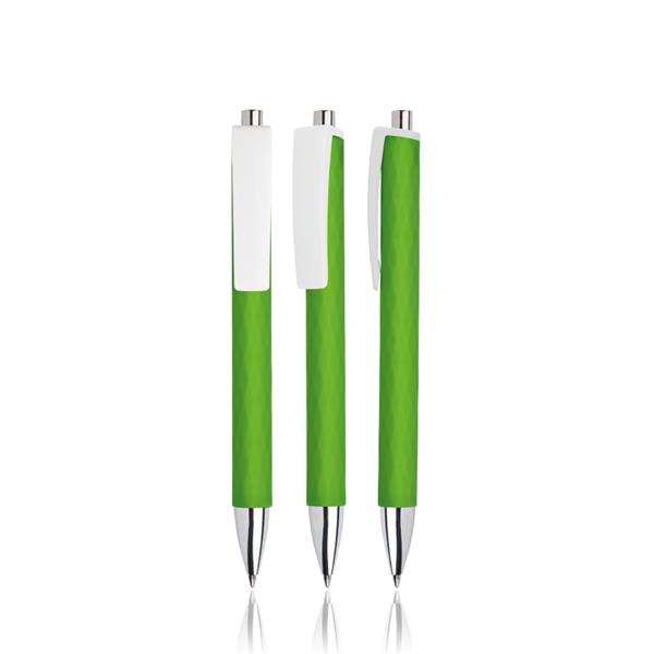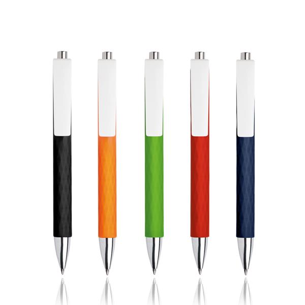 Esferográfica de plástico com clip largo. Escrita preta e sistema pulsar. O que salta à vista nesta caneta é o seu clip largo, branco e perfeito para deixar a sua marca. Se olhar com atenção, outro pormenor preza pela diferença: no corpo, um padrão de losango com textura em relevo. Não ofereça apenas uma esferográfica, aposte no destaque!