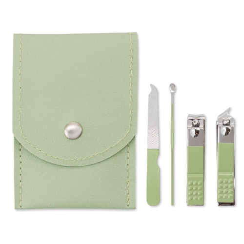 Kit de manicure, disponível em quatro cores, inclui dois corta-unhas, uma lima de unhas e uma ferramenta para cutículas.