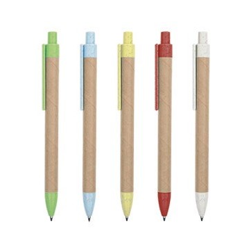 Caneta feita de papelão reciclado durável e palha de trigo com ABS, tornando-se um produto mais sustentável e ecológico. Com clip e sistema de botão, disponível em várias cores.