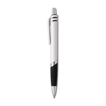 Caneta de plástico ABS com pega colorida e detalhes prateados, utiliza tinta azul e tem uma variedade de cores.