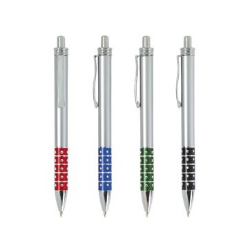 Caneta esferográfica de plástico ABS com clipe de metal. Área de pegada decorada com brilhos, combinada com corpo prateado. Inclui carga jumbo para maior durabilidade da tinta.