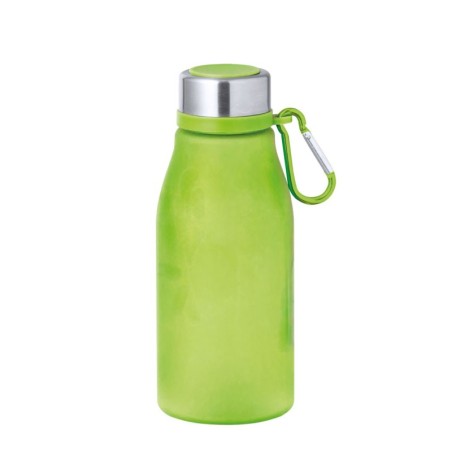 Garrafa em RPET de 370 ml de capacidade. Tampa de segurança de rosca em aço inoxidável e prático mosquetão metálico com cor a condizer com a garrafa. Disponível numa variada gama de cores sólidas em acabamento mate. Livre de BPA e apresentada numa atrativa caixa de design kraft. O material RPET é elaborado a partir de plástico reciclado, para assim fomentar a reutilização de resíduos plásticos e ajudar à sustentabilidade do planeta.