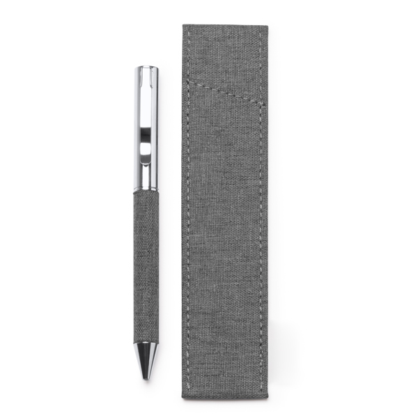 Esferográfica com mecanismo de torção em metal e poliéster RPET. Tinta azul. Apresentação numa bolsa de poliéster RPET a condizer.