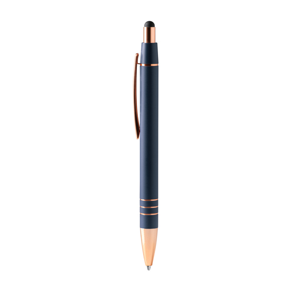 Caneta de botão de pressão com corpo metálico mate e detalhes em cabos de cobre. Ponteiro de toque no botão. Recarga de tinta Jumbo em azul.
