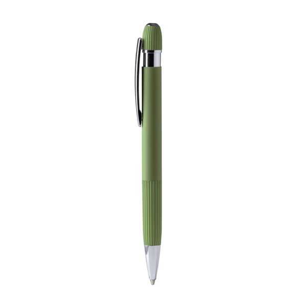 Caneta com corpo em alumínio reciclado com pega às riscas e acabamento tátil em borracha mate. Pormenores em acabamento cromado. Recarga de tinta Jumbo em azul.