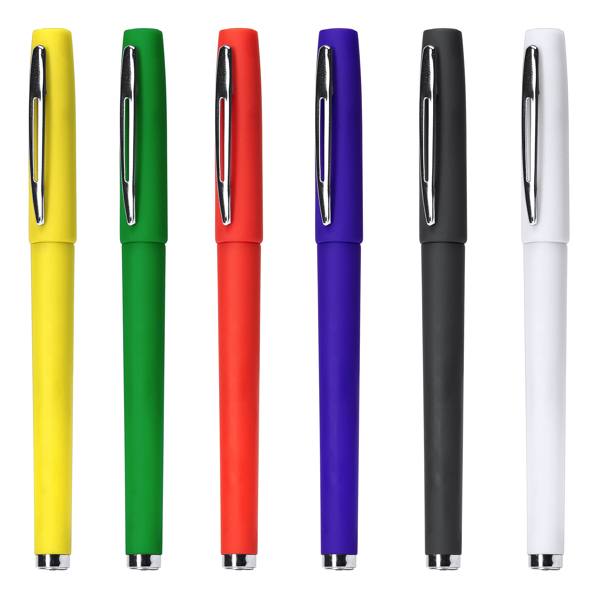 Caneta rollerball com corpo em ABS de toque suave. Clipe e ponta de metal. Carga jumbo com tinta azul.