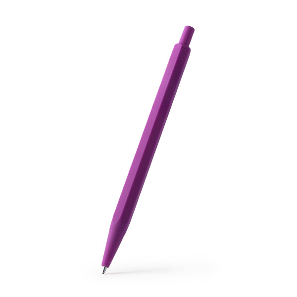 Esferográfica em ABS reciclado com botão de pressão. O corpo apresenta um design hexagonal colorido com um acabamento mate, o que lhe confere um aspeto original e elegante. Tinta azul.